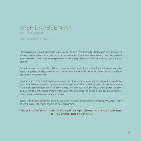 Today, I manage the production of rice in large quantities, processing it and selling it in bags at the market.